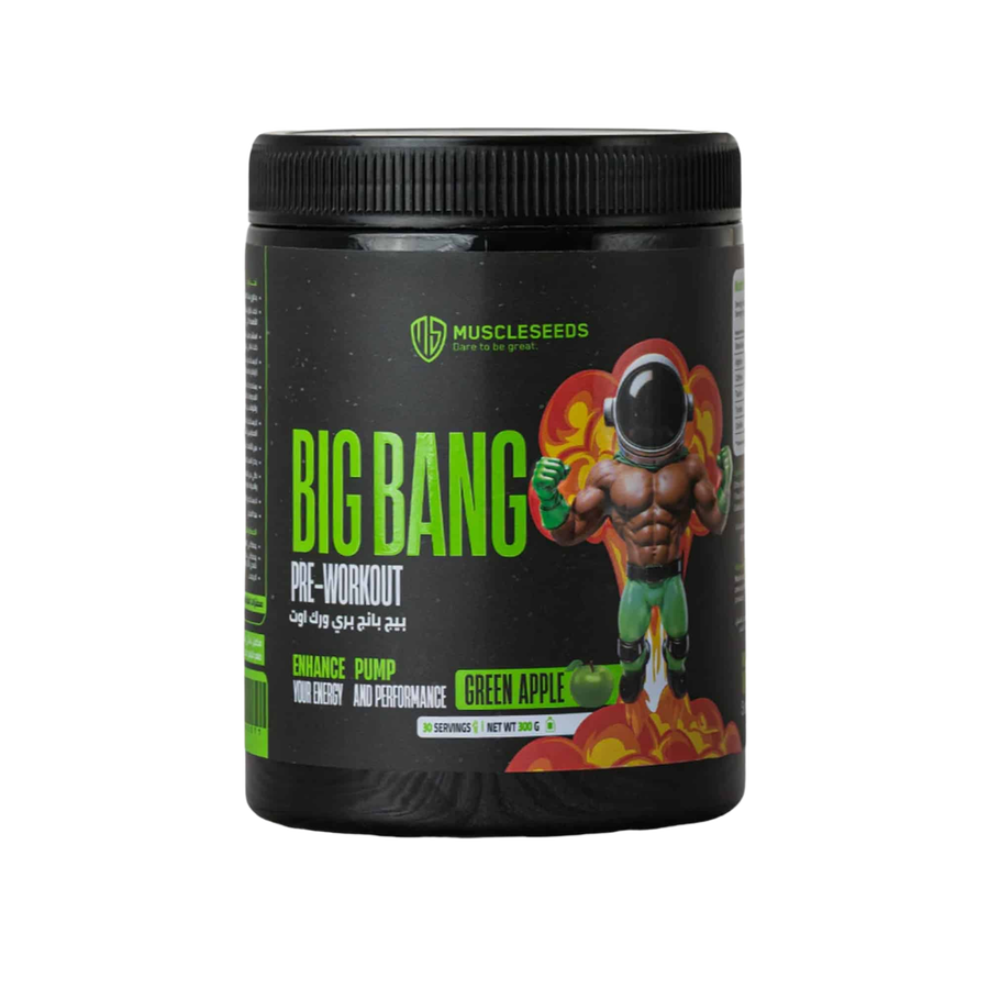Big Bang Pre-Workout من MuscleSeeds – بري ورك أوت فائق القوة بنكهة التفاح الأخضر 🍏 يحتوي على مزيج من الكافيين، بيتا ألانين، أرجنين وتورين لدعم الطاقة، التركيز، وزيادة ضخ الدم أثناء التمرين – 30 جرعة